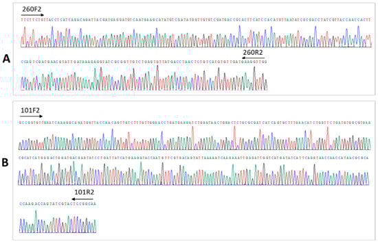 Results of Sanger sequencing of the amplicons from contigs xx03_260 (A) and xx03_101 (B). Each amplicon was sequenced in both directions. Priming sites for sequencing are indicated.