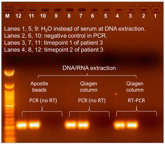 Summarized (RT) PCR results for samples from Patient 3. Serum samples were collected from Patient 3 at two timepoints. M, 50 bp DNA ladder (NEB).