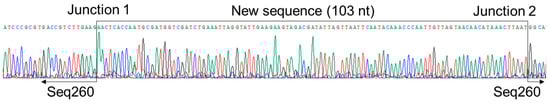 Results of genome walking at the 3′ end of Seq260. The Sanger sequencing map is shown for the domain covering the novel 103 nt sequence that was extended with genome walking. Two junction sites between the known Seq260 and newly extended sequences are indicated.
