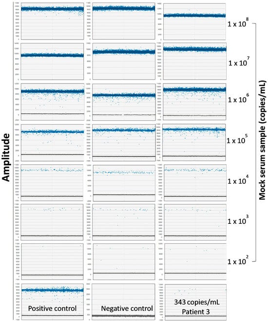 Quantitation of Seq260 copy number in serum. Amplitude outputs of digital-droplet PCR (ddPCR) from Patient 3 (bottom right) and the mock serum samples with concentrations of gBlocks Seq260 from 100 to 1 × 108 copies/mL. Each mock serum sample was set up with three technical replicates.