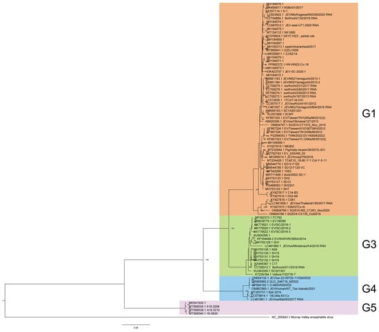 JEV is a natural focus pathogen and sustains its transmission cycle through mosquito vectors and mammalian hosts within ecosystems []. Human and animal infections arise primarily through bites from hematophagous vectors, making the diversity of JEV vectors (e.g., mosquitoes), reservoir hosts, and the spatiotemporal distribution of viral isolates pivotal in shaping its epidemiology. Recent genomic surveillance highlights genotype 1 (G1) replacing genotype 3 (G3) as the predominant circulating lineage, with G1 exhibiting reduced host diversity compared to G3 []. However, current understanding remains limited by a critical temporal gap: most data predate 2012, obscuring the ecological dynamics of JEV vectors/hosts and genotype transitions over the past decade. This study analyzes 2012–2022 shifts in JEV transmission through the comparative molecular evolution of full-genome sequences, the spatiotemporal mapping of isolates, and vector–host interactions. A phylogenetic analysis of 2012–2022 genomes confirms sustained divergence between G1 and G3, while the signaling potential emergence of G4 and G5 genotypes in Asia requires vigilance. Mosquitoes—notably Culex tritaeniorhynchus—and swine remain central amplification hosts, affirming their indispensable role in viral ecology. Despite JEV’s evolving host adaptations, the mosquito–swine cycle remains its dominant transmission pathway, necessitating sustained vector control and targeted surveillance of these primary transmission routes.
