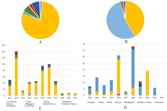Regional composition of G1 and G3 JE virus isolates in 2012–2022. (A) The regional composition ratio of G1 JEV isolates during 2012–2022. (B) The regional composition ratio of G3 JEV isolates during 2012–2022. (C) The country composition of G1 JEV isolates from each year during 2012–2022. (D) The country composition of G3 JEV isolates from each year during 2012 to 2022. Note: The color representations for different countries in (A)/(B) correspond to those in (C)/(D), respectively.