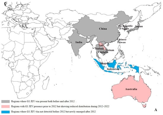 Regional distribution of G1 and G3 JEV from 1930 to 2022 []. (A) Regional distribution of G1 JEV. Gray areas: regions where G1 JEV was present both before and after 2012; red areas: regions with G1 JEV presence prior to 2012 but showing reduced distribution during 2012–2022; blue areas: regions where G1 JEV was not detected before 2012 but newly emerged after 2012. (B) Regional distribution of G3 JEV. Gray areas: regions where G3 JEV persisted both before and after 2012; yellow areas: regions with G3 JEV presence before 2012 but reduced distribution after 2012; green areas: regions where G3 JEV was absent before 2012 but newly emerged after 2012 (e.g., Africa); white areas: Oceania, where G1 and G3 JEV has never been detected.