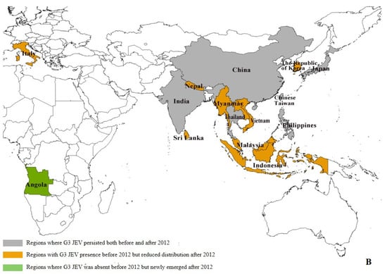 Our data reveal significant geographical shifts in G1 JEV distribution in the post-2012 period. In East Asia, mainland China, Chinese Taiwan, and Japan maintained their historical G1 predominance, demonstrating persistent endemic circulation. In South Asia, G1 remains potentially present only in India, and even there, at relatively low prevalence levels (pre-2012: 6.39% (29/454), post-2012: 1.97% (11/559)). Notably, we observed emerging G1 hotspots across Southeast Asia, particularly in Singapore (pre-2012:0, post-2012:4) and Indonesia (pre-2012:0, post-2012:1), (Supplementary Table S4), where increased isolation rates may indicate evolving transmission dynamics and potential establishment of new endemic foci (Figure 3A). The post-2012 period shows distinct regional variations in G3 circulation patterns. While mainland China (East Asia) and India (South Asia) maintain active G3 transmission, we documented reduced G3 activity in Japan (pre-2012: 15.03% (66/439), post-2012: 1.34% (2/149)) and Chinese Taiwan (pre-2012: 18.22% (80/439), post-2012: 0.67% (1/149)). In Southeast Asian countries such as Malaysia, Indonesia, Vietnam, Sri Lanka, and Myanmar, as well as in Nepal in South Asia, G3 has not been detected since 2012 (Supplementary Table S4). Our analysis reveals concerning evidence of G3 JEV expansion beyond its traditional endemic range. With the exception of Angola, where the first local human case of G3 has been reported, local zoonotic transmission in Africa has been confirmed []. Although G3 JEV was detected in European mosquito populations [] and bird hosts (GenBank: AF501311–AF501315) prior to 2012, no new evidence of active transmission has been reported in Europe since then. However, these historical detections suggest potential environmental persistence and previously unrecognized enzootic cycles in non-endemic regions. These findings highlight the expanding geographical range of G3 JEV and underscore the need for enhanced global surveillance. (Figure 3B).