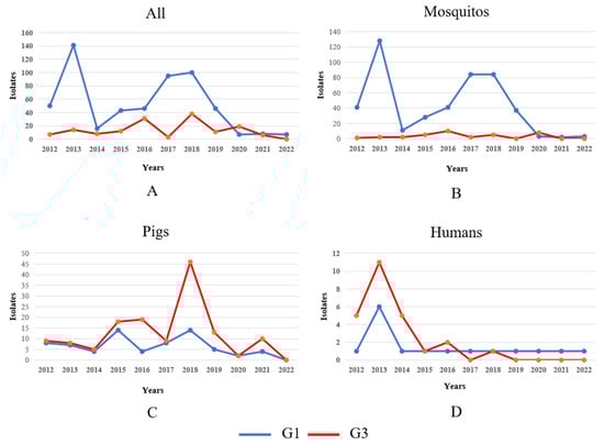 Temporal dynamics of G1 and G3 JEV isolates in different hosts in 2012–2022. Note: The blue and red lines in the figure represent the changes in the number of G1 and G3 JEV isolates, respectively. (A) Temporal dynamics of G1 and G3 JEV isolates in mosquitos, pigs, and humans from 2012 to 2022. (B) Temporal dynamics of G1 and G3 JEV isolates in mosquito from 2012 to 2022. (C) Temporal dynamics of G1 and G3 JEV isolates in pigs from 2012 to 2022. (D) Temporal dynamics of G1 and G3 JEV isolates in humans from 2012 to 2022.