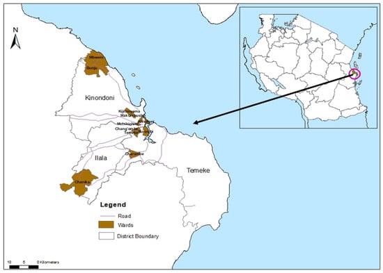 The study was conducted in Dar es Salaam, Tanzania’s largest economic hub (Figure 1). The city is located at 6.48′ S and 39.17′ E on the Indian Ocean coast, with a population of approximately 7 million [63]. Administratively, it consists of five districts: Ilala, Kigamboni, Kinondoni, Temeke, and Ubungo. Based on previous dengue outbreaks [53,64], Ilala (1,649,912 people), Kinondoni (982,328), and Temeke (1,346,674) [63] were selected for this study.