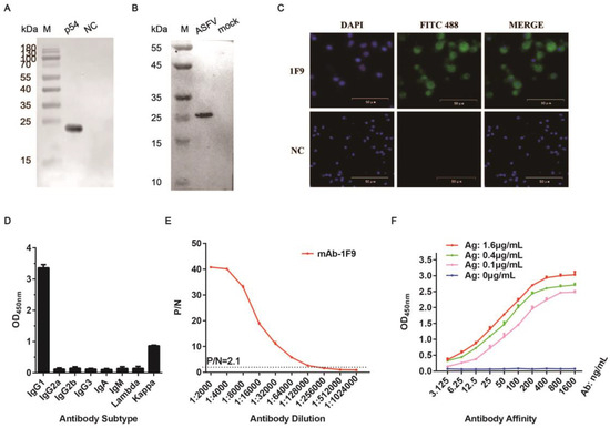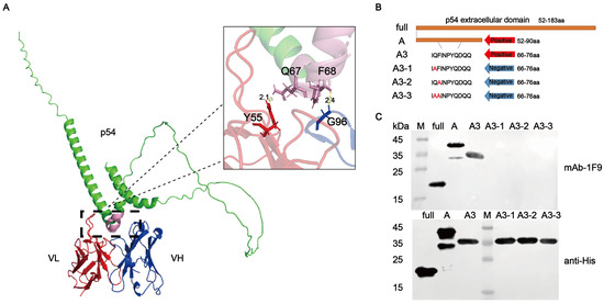- Wang, A.; Jiang, M.; Liu, H.; Liu, Y.; Zhou, J.; Chen, Y.; Ding, P.; Wang, Y.; Pang, W.; Qi, Y.; et al. Development and characterization of monoclonal antibodies against the N-terminal domain of African swine fever virus structural protein, p54. Int. J. Biol. Macromol. 2021, 180, 203–211. [Google Scholar] [CrossRef] [PubMed]