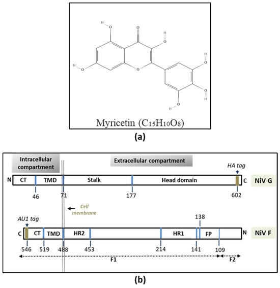 (a) Structure of myricetin (MYR; 3,5,7-trihydroxy-2-(3,4,5-trihydroxyphenyl) chromen-4-one) also known as cannabiscetin, a bioflavonoid evaluated in this study. URL: https://pubchem.ncbi.nlm.nih.gov/compound/5281672#section=Structures (accessed on 12 January 2020) (b) Codon-optimized wild-type (WT) Nipah virus attachment glycoprotein G (NiV-G) and fusion glycoprotein F (NiV-F). The components of F and G plasmids and their amino acid positions are represented. The F and G detection tags (HA/AU1) are highlighted in the plasmids. The cellular positions of F and G with respect to the intracellular and extracellular compartments are represented by a dotted line across the plasmid organization.