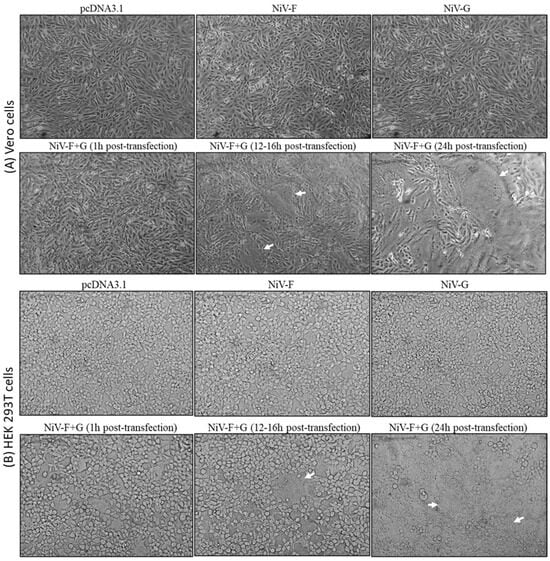 Phase-contrast microscopy images of syncytial development at different time intervals post-transfection with NiV WT F and G plasmids in (A) Vero cells (B) HEK293T cells. Quantifiable syncytia were observed at 12–16 h post-transfection, while syncytial progression was extensive at 24 h post-transfection. The arrows indicate the presence of syncytia in multi-well cell culture plate.