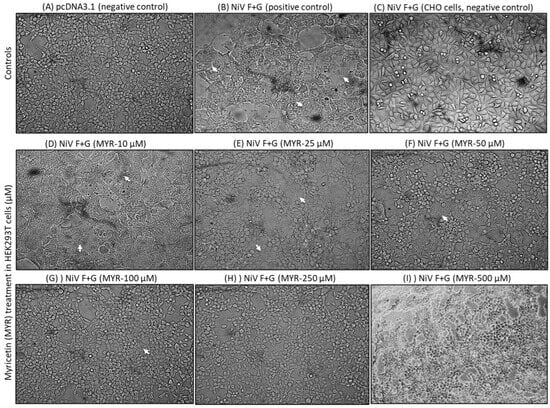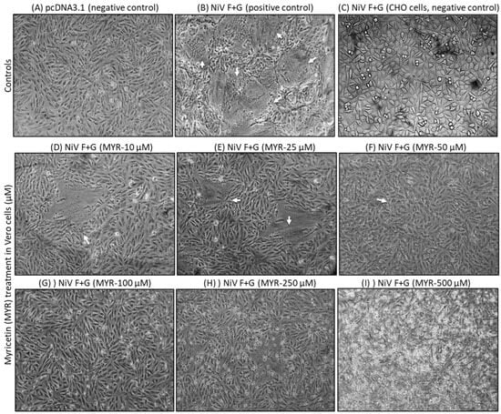 Phase-contrast microscopy images of inhibition of syncytial development (indicated by arrows) in HEK 293T cells by myricetin (MYR) when added at different concentrations 1 h post-transfection with NiV WT F and G plasmids. CHO cells were included as additional negative control. The arrows indicate the presence of syncytia in multi-well cell culture plate.