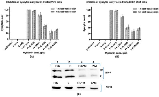 Inhibition of syncytial development by myricetin (MYR) with different concentrations after the addition of MYR post-transfection (A) Vero cells (B) HEK293T cells. (C) Western blot analysis of the cell lysate of HEK 293T cells (transfected with NiV F and G plasmids) with and without MYR (100 μM) addition 1 h post-transfection. (a) Lane-1 (NiV F+G) and Lane-2 (NiV F only) without MYR; Lane-3 (NiV F+G) and Lane-4 (NiV F only) with MYR.
