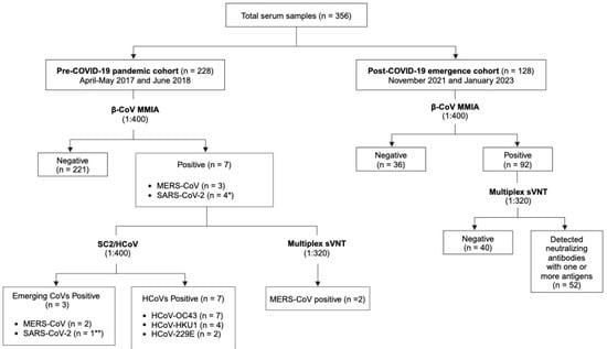 Serological screening of serum samples using MMIA and multiplex sVNT. The pre-pandemic samples positive by the β-CoV MMIA were further tested using the SC2/HCoV MMIA and the multiplex sVNT. Post-COVID-19 emergence samples positive by the β-CoV MMIA were further tested using the multiplex sVNT to determine percent signal inhibition. * Two samples were positive with more than one antigen, with the MFI against SARS-CoV-2 being highest. ** One sample was weakly positive for SARS-CoV-2 (4952 MFI, see Table S1 by the SC2/HCoV MMIA. Created in BioRender (https://BioRender.com).
