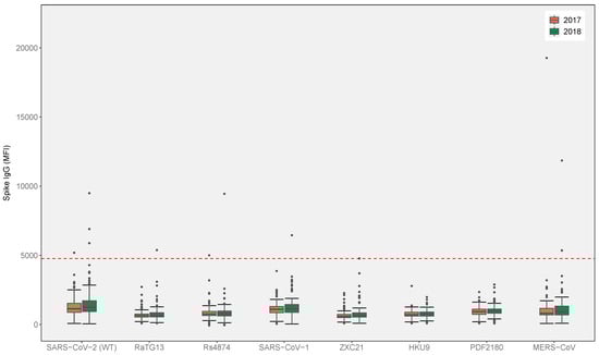 The β-CoV MMIA serological screening of pre-pandemic cohort (n = 228). Serum samples collected in 2017 (n = 113) and 2018 (n = 115) were tested at a 1:400 dilution for IgG reactivity to spike proteins of betacoronavirus to simultaneously detect emerging human coronaviruses and bat coronaviruses. IgG MFI values above the threshold cutoff (4774 MFI, indicated by the red dashed line) were considered seropositive.