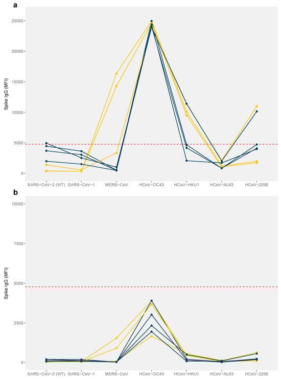 MFI levels of IgG antibodies in betacoronavirus-positive pre-pandemic samples (n = 7). (a) sera diluted at 1:400 and (b) at 1:8000 were tested. IgG levels (MFI) above 4774 indicate seropositivity (indicated by the red dashed line). Teal and yellow lines represent SARS-CoV-2 and MERS-CoV seropositive samples by the β-CoV MMIA, respectively.