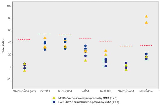 A multiplex surrogate virus neutralization (sVNT) assay was performed to further investigate neutralizing antibodies of serum samples previously positive by the binding MMIA. The sVNT assay targeting the receptor-binding domain (RBD) of SARS-CoV-2 (ancestral strain), SARS-CoV-1, bat CoV RaTG13, bat CoV WIV-1, bat CoV Rs2018B, bat CoV RsSHC014 or the spike proteins of MERS-CoV [published elsewhere]. The design of the RBD proteins and antigen coupling processes have been described previously [15,16,17]. The multiplex sVNT protocol was followed as described in a previous publication [15,18]. Briefly, serum samples were heat-inactivated at 60 °C for 30 min. A master mix of RBD-coat beads was incubated with serum samples with a dilution of 1:320 at 37 °C for 60 min with agitation, followed by 50 µL of phycoerythrin-conjugated human angiotensin-converting enzyme 2 (ACE2) and human dipeptidyl peptidase-4 (DPP-4) receptors (2 mg/mL; Genscript), and incubated at 37 °C for 30 min with agitation. Subsequently, plates were washed twice with 1% bovine serum albumin in 1XPBS (assay buffer) and resuspended with assay buffer before obtaining the final readings using Bio-Plex 200 HTF multiplexing system (Bio-Rad). Neutralizing antibody levels were calculated and reported as percent signal inhibition.