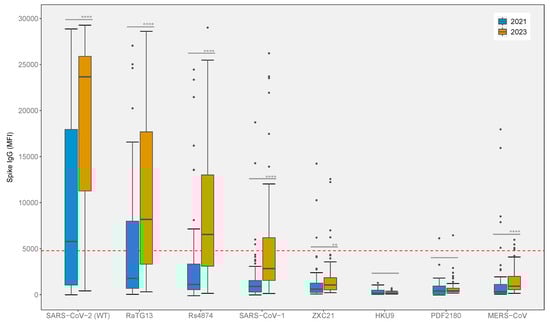 The spike IgG reactivity against betacoronaviruses of serum samples collected in 2021 and 2023 were tested using the β-CoV MMIA. We observed a significant IgG cross-reactivity between SARS-CoV-2 WT, RaTG13 and Rs4874 in serum samples collected in 2023 compared to 2021 (p-values ≤ 0.0001) with the median MFI levels above the threshold cutoff (Figure 5). The median MFI levels were 23,669 and 5774 for SARS-CoV-2 WT, 8180 and 1775 for RaTG13 and 6545 and 1116 for Rs4874 in 2023 and 2021, respectively. In addition, a higher positive rate of three antigens was shown in serum samples collected in 2023 compared to 2021: 83.56% and 54.55% for SARS-CoV-2, 67.12% and 30.91% for RaTG13 and 57.53% and 18.18% for Rs4874, respectively, highlighting the cross-reactivity induced by the administration of COVID-19 vaccines with or without SARS-CoV-2 infection. We observed a significant difference in median MFI for SARS-CoV, ZXC21 and MERS-CoV; however, the median MFI values were below the threshold cutoff (Figure 5).