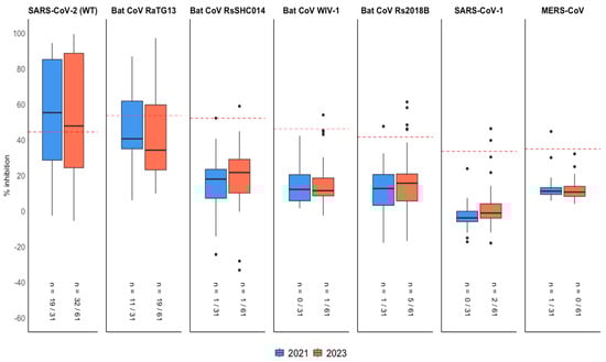 Multiplex sVNT assay of post-COVID-19 betacoronavirus-positive samples (n = 92). Serum samples collected in 2021 (n = 31) and 2023 (n = 61) were diluted 1:320 and tested for surrogate neutralizing antibodies against sarbecovirus RBDs and MERS-CoV spike (S1). Red dashed lines represent threshold cutoff values for each antigen.