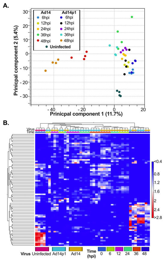Unsupervised analysis of miRNA expression during Ad14 and Ad14p1 infection. A549 cells were infected with Ad14 or Ad14p1 at 10 PFUs per cell, and miRNAseq was performed from total RNA at the indicated times. (A) Principal component analysis plot of cellular miRNA expression during Ad14 and Ad14p1 infection. (B) Heatmap with Euclidean distance clustering of miRNA expression of the top 75 features.
