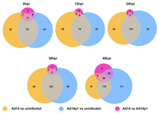 The heatmap analysis showed that both Ad14 and Ad14p1 miRNA profiles between 6 and 36 hpi were similar, while at 48 hpi they were not. A Venn diagram analysis was used to understand the differences in the miRNA expression profiles in Ad14- vs. Ad14p1-infected cells. As seen in Figure 2, approximately 50% of the differentially expressed miRNA in Ad14- and Ad14p1-infected cells were shared (overlap of yellow [Ad14] and blue [Ad14p1] circles). Differential miRNA expression between Ad14- and Ad14p1-infected cells (Figure 2, pink circles) showed that, between 6 and 36 hpi, only 8–23 miRNA were differentially expressed in either strain. At 48 hpi, there were 98 differentially expressed miRNA in Ad14-infected cells compared with Ad14p1-infected cells. A total of 55 of the 98 miRNAs were differentially regulated in Ad14- vs. Ad14p1-infected cells and Ad14p1-infected vs. uninfected cells. Five were differentially regulated in Ad14- vs. Ad14p1-infected cells and Ad14-infected vs. uninfected cells. Thirty were differentially regulated in all comparisons, and eight were only differentially regulated in Ad14- vs. Ad14p1-infected cells.