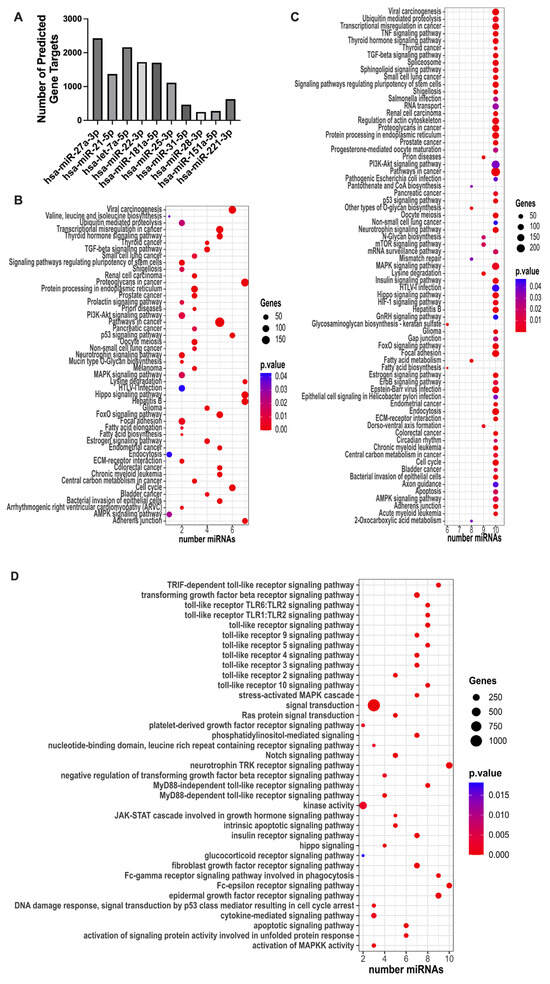 Bioinformatic analysis of Ad14 miRNA by mirPath V3. The 10 enriched miRNAs in Ad14 CPE corpses were uploaded to mirPath V3. (A) Total number of predicted target genes per miRNA. (B) Dot plot of the KEGG pathways union analysis. (C) Dot plot of the KEGG genes union analysis. (D) Dot plot of the signaling pathways identified by the GO categories union analysis.