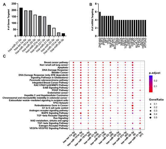MIENTURNET target and functional enrichment of Ad14 miRNA. The 10 enriched miRNAs in Ad14 CPE corpses were uploaded to MIENTURNET. Target enrichment was performed with miRTarBase with a minimum of 2 miRNA–RNA interactions and an FDR threshold of 1. (A) Number of genes targeted per miRNA. (B) Number of miRNAs targeting each predicted gene for genes that were targeted by ≥4 miRNAs. (C) Dot plot of the WikiPathways functional enrichment. Number of genes targeted by each miRNA are shown in parentheses.