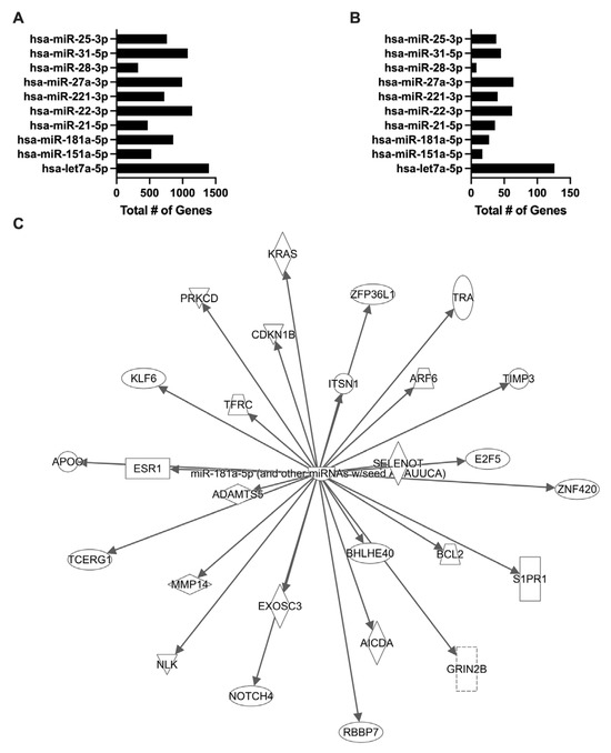 Ingenuity pathway analysis of Ad14-enriched miRNAs. (A,B). An IPA microRNA filter analysis was performed on the 10 Ad14-enriched miRNAs. The number of genes targeted by each miRNA is shown for unfiltered (A) and filtered (B) for cell type (macrophages), pathways (cellular stress and injury, cytokine signaling, disease-specific pathways, and pathogen-influenced signaling), and confidence level (experimental observed and highly predicted). (C) Visualization of the miR-181a-5p:mRNA target network from the filtered data.