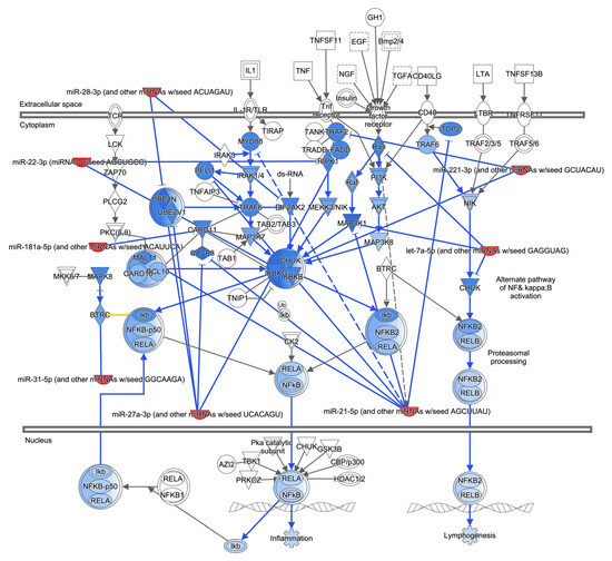 Effect of Ad14 miRNAs on the NF-κB signaling pathway. IPA was used to predict the effects of Ad14 miRNAs on proteins involved in activating NF-κB-dependent transcription. Lines ending with an arrowhead show the direction of activation, while lines ending with a dash show the direction of inhibition. Solid blue lines indicate validated repressive effects of miRNA–target interactions, while dashed blue lines are for predicted repressive effects of miRNA–target interactions. Red crescents are miRNAs, and the remaining shapes are proteins in the NF-κB pathway. Dark blue shapes are direct targets of the Ad14 miRNAs, while light blue shapes are predicted to have decreased activation based on repression of an upstream activator.