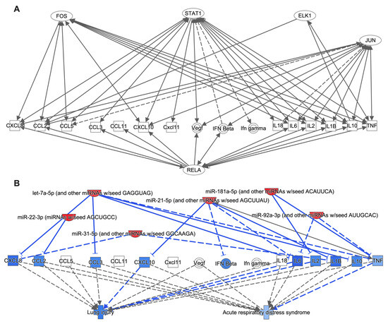 Bioinformatic analysis of regulation of chemokine and cytokine expression. (A,B). IPA was used to probe the relationships of transcription factors (A) and Ad14 miRNA (B) on the expression of chemokines and cytokines involved in ALI and ARDS. Lines ending with an arrowhead show the direction of activation, while lines ending with a dash show the direction of inhibition. Solid blue lines indicate validated repressive effects of miRNA–target interactions, while dashed blue lines are for predicted repressive effects of miRNA–target interactions.