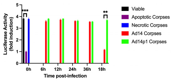 Effect of Ad14- and Ad14p1-infected A549 cells on NF-κB-dependent transcription in non-professional phagocytes. A549 cells were infected with 10 PFUs of Ad14 or Ad14p1 per cell. Adherent and floating cells were collected at 6, 12, 24, 36, and 48 h post-infection. Viable, apoptotic corpses, necrotic corpses, or infected cells were incubated with a 293 NF-κB luciferase reporter cell line at a ratio of 10 infected cells or viable cells per reporter cell in the presence of 2nM PMA. Values are the means ± standard error of the means. A one-way ANOVA test was performed, and p-values were determined by a post hoc Holm–Sidak test for infected cells compared with viable cells. *** p < 0.001, ** p = 0.0063.