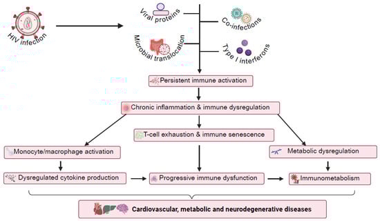 One of the most well-studied examples of chronic inflammation as a disease driver is human immunodeficiency virus (HIV) infection [8], where persistent immune activation and systemic inflammation contribute to disease progression and non-AIDS (acquired immunodeficiency syndrome)-related comorbidities [9]. Here, individuals with HIV often exhibit elevated levels of inflammatory markers, immune dysfunction, increased CVD risk, neurocognitive impairment, and metabolic disorders despite effective antiretroviral therapy (ART) suppressing viral replication [9,10]. Such chronic immune activation is driven by ongoing viral replication in reservoirs, microbial translocation, and immune dysregulation and renders HIV a compelling model for understanding the long-term consequences of inflammation in human disease [9,11,12].