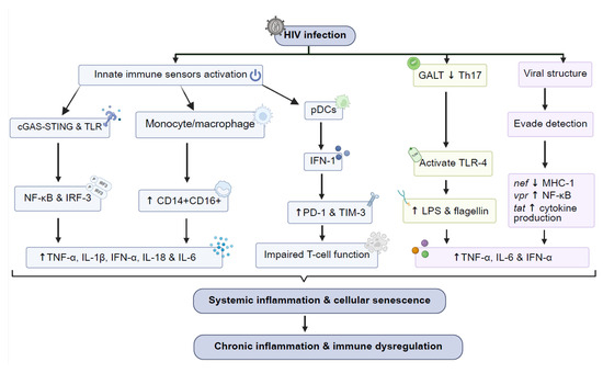 The second major driver of chronic inflammation is gut mucosal barrier disruption. Here, HIV preferentially depletes CD4⁺ T cells in gut-associated lymphoid tissue (GALT), leading to epithelial damage and impaired immune containment. This permits microbial translocation, where bacterial products such as lipopolysaccharide (LPS), flagellin, and bacterial DNA enter systemic circulation and activate monocytes and macrophages via TLR signaling [26,27]. This results in elevated production of IL-1β, IL-18, and TNF-α, further amplifying inflammation [1,28].