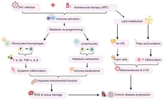Lipid metabolism plays a crucial role in the inflammatory processes associated with HIV infection, contributing to immune activation, viral persistence, and an increased risk of metabolic disorders. One of the most significant alterations occurs in cholesterol metabolism, where HIV-infected immune cells exhibit abnormal lipid accumulation. This is particularly evident in macrophages which engulf excess lipids and transform into foam cells—a well-described hallmark feature of atherosclerosis. The formation of foam cells promotes vascular inflammation and plaque development, significantly increasing the risk of CVD in PLWH [104,105]. HIV also affects fatty acid metabolism to further enhance chronic inflammation. As fatty acids serve as key bioactive molecules in immune signaling, their dysregulation creates an inflammatory microenvironment that supports viral persistence and immune activation. Here, infected immune cells such as macrophages and T cells exhibit altered fatty acid oxidation, leading to a shift toward a pro-inflammatory phenotype. This metabolic state favors the continuous activation of immune pathways and reinforces systemic inflammation and the impairment of immune resolution mechanisms [11,92].