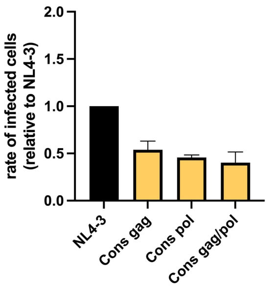 All three viral clones with consensus sequences were replication-competent in vitro. Infection rates of viral particles with consensus gag reached a factor of 0.54, viral particles with consensus pol reached a factor of 0.46, and those with consensus gag and pol reached a factor of 0.40 of NL4-3 (Figure 2). Infection rates of all three consensus variants were significantly lower than that of NL4-3. Differences in replication capacity between the three consensus variants were not statistically significant (Supplementary Table S2. Thus, whereas the reduction in infectivity was most pronounced for the consensus gag/pol variant, there seems to be no pure additive effect on infectivity by combining consensus gag and pol sequences.