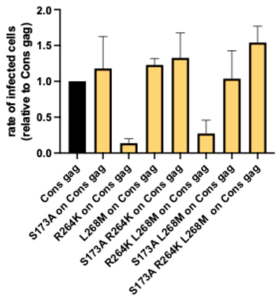 We generated viral constructs containing mutations S173A, R264K, and L268M individually, as well as double and triple mutants, on the newly generated consensus gag backbone and compared their replicative capacities in vitro with that of the gag consensus NL4-3 variant (Figure 3). The infection rates of the variant carrying the primary CTL escape mutation R264K (RK on Cons gag) was significantly reduced to 0.14 of the unmodified consensus gag construct, whereas the combination of R264K with L268M (RKLM on Cons gag) had less impact on replication, with a factor of 0.27 (Figure 3 and Supplementary Table S2). In contrast, compensatory mutation S173A led to increased infection rates beyond the Cons gag standard both in the absence and presence of R264K (1.18 for SA on Cons gag, 1.54 for SARKLM on Cons gag, and 1.33 SARK on Cons gag, respectively).