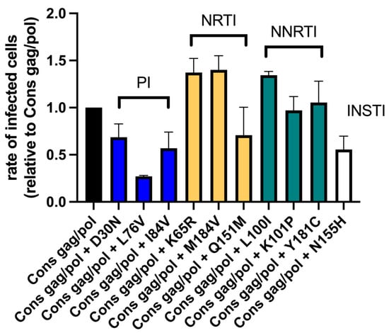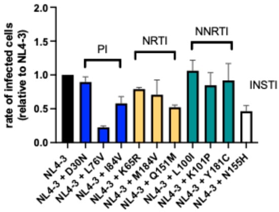 Consistent with previously published data [76,77,78,79] for the NL4-3 backbone, most drug resistance mutations led to a reduction in infected cells in vitro at different levels. Only the variant with the L100I mutation replicated at higher levels than NL4-3 (factor 1.06), whereas the remaining nine drug resistance mutation variants led to reduced infection rates, levels between 0.91 (Y181C) and 0.23 (L76V) were recorded (Figure 4 and Supplementary Table S3).