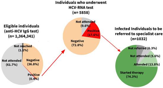 Italy has the highest estimated seroprevalence of HCV in Europe and, in line with WHO objectives, has allocated over EUR 70 million to develop free regional screening programs [9,10]. In January 2022, the Emilia-Romagna Region, located in northern Italy, started a population-wide screening program to identify HCV-positive adults and promote treatment [11]. We present the results of the first two years of the screening program, in terms of screening adherence, detection rates, and treatment uptake.