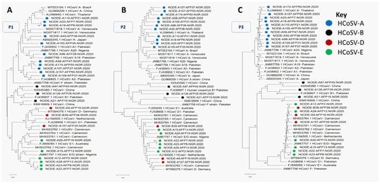 Maximum likelihood phylogenetic trees of HCoSV variants described in this study alongside some reference sequences. Analysis was conducted using nucleotide sequences of the complete (A) P1, (B) P2, and (C) P3 genomic regions.