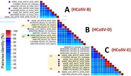 Pairwise identity analysis of HCoSV-B (A), D (B), and E (C) variants described in this study alongside some reference sequences. Analysis was conducted using the VP1* amino acid sequence as described in [24]. The 12 HCoSV-B, D, and E variants detected in this study are indicated with circles. Black circles denote variants belonging to genotypes that had been previously assigned. Purple circles denote variants belonging to tentative new genotypes. Please note that sequence IDs at the bottom of the matrix have been removed to enhance visibility.