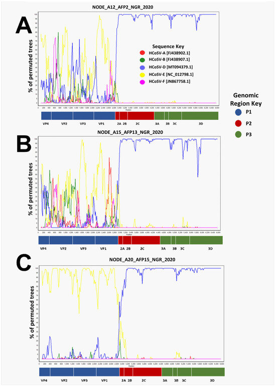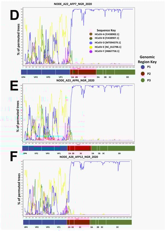 Positive-sense single-stranded RNA viruses, such as HCoSVs, prominently demonstrate high rates of recombination [45,46]. A Nigerian AFP patient was the source of the first report of the recombination pattern of HCoSVs at the P1/P2 junction in 2012 (strain NG385; JN867757). Subsequent detections also include a clinical case in a Brazilian patient with acute gastroenteritis in 2018 and identification in asymptomatic children from Venezuela in 2015 (strain BRTO-83) [22,24,47]. We now report the sequencing of six (6) nearly complete genomic sequences of recombinant (E/D) HCoSV strains from 2020 Nigerian AFP samples that were poliovirus negative. Phylogenetic analysis and pairwise amino acid identity comparisons between the six genomes and reference genomes of species A-F from GenBank revealed that the six genomes shared greater similarity with species E in the P1 region (>65%) (Figure 1 and Figure 2), whereas they were more closely related to species D in the P2 and P3 genomic regions (Figure 1). Furthermore, Bootscan analysis substantiates the occurrence of a recombination event at the P1/P2 junction (Figure 5). This pattern mirrors the initial observation of HCoSV recombination in the Nigerian AFP sample [24], thus making this study a second report of HCoSV recombinant E/D strains in Nigeria. Following the VP1* pairwise identity analysis, one of the six variants of HCoSV-E (Figure 1 and Figure 2) was identified as a member of HCoSV-E1 (≥88% aa similarity), while the remaining five were found to belong to two tentative new genotypes with one and four members each (Figure 4). Hence suggesting HCoSV-E might also be more diverse than currently documented.