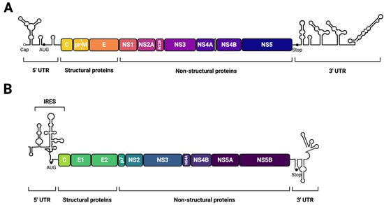 A schematic representation of the Flavivirus (A) and Hepacivirus (B) positive-sense, single-stranded RNA genomes. Both genomes are flanked by 5′ and 3′ untranslated regions (UTRs). The single open reading frame is translated into a polyprotein which is co- and post-translationally cleaved into three structural proteins and seven non-structural proteins. Flavivirus genomes feature a type-I cap within the 5′UTR, whilst Hepacivirus genomes feature a type-III internal ribosome entry site (IRES) within the 5′UTR.