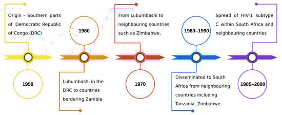 Twenty years after the first instance of HIV-1 (1930s), the subtype C is thought to have originated in Mbuji-Mayi in the Democratic Republic of Congo in the 1950s. Subsequently, infections spread from Mbuji-Mayi to South Africa through its bordering countries, including Lubumbashi, Zimbabwe, Uganda, Kenya, Ethiopia, and Tanzania. Factors such as increased migration, socio-political scenario, and increased trade facilitated the dissemination of subtype C variants in South Africa [5,21]. Figure 1 describes the origin, timeline, and spread of subtype C. Tracing the origin and spread of subtype C helps in understanding its current global dominance. Despite accounting for nearly half of the infections worldwide [20,21], subtype C remains less explored than the subtype B variant. Additionally, the inhibitors developed to target the key enzymes such as RT, PR, and IN are primarily designed for subtype B [22], rendering them ineffective when used for subtype C [23]. RT and IN play vital roles in various stages, including RNA to DNA conversion and viral-host DNA integration, while PR is crucial for the maturation of the virus [24].