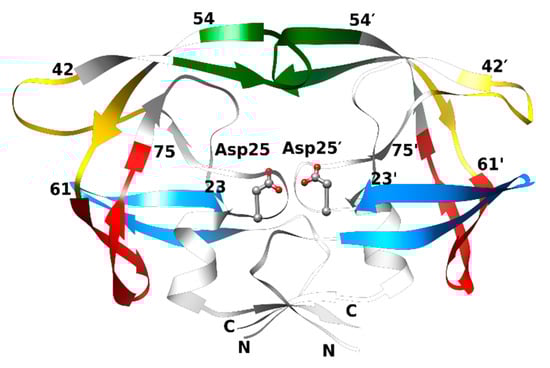 HIV PR is a functional homodimer comprising 99 amino acids in each subunit [30,31]. The three-dimensional structure of HIV PR is shown in Figure 2. The catalytic triad contains conserved active site residues Asp25, Thr26, and Gly27. It hydrolyses the peptide bond in the substrate gag-pol protein, resulting in the production of structural proteins such as matrix (MA), capsid (CA), nucleocapsid (NC), and functional enzymes (PR, RT, and IN) that constitute the core of the HIV. The catalytic mechanism of PR is described elsewhere [32]. Conformational changes that occur between the open and closed states of the PR, governed by the concerted movement of flaps, hinge, cantilever, and the fulcrum, are crucial for its function. The open state facilitates substrate/ligand binding and product release, whereas the closed state is crucial for substrate cleavage, yielding structural proteins [33,34,35]. Inhibitors are designed to impede the function of PR by competitively binding in place of the substrate, thereby attenuating the formation of structural proteins [36].