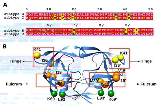 The analysis of PR genes from drug-naive patients revealed that the HIV-1 PR subtype C sequence differed from the consensus subtype B at eight residues, namely, T12S, I15V, L19I, M36I, R41K, H69K, L89M, and I93L (Figure 3A) [39]. Figure 3A illustrates the sequence alignment between HIV-1 PR subtypes B and C, and Figure 3B highlights the locations of polymorphisms (S12, V15, I19, I36, K41, K69, M89, and L93) within the structure of HIV-1 PR subtype C. Although analogous substitutions are also present in subtype B PR sequences, the frequency of occurrence of these substitutions was notably higher in the HIV-1 PR subtype C. For instance, R41K was found in 100% of the subtype C sequences, whereas the frequencies for H69K, I93L, and M36I were 98.7%, 96.2%, and 87.3%, respectively. These findings have led to the classification of these substitutions as naturally occurring polymorphisms corresponding to subtype C [39,40]. These polymorphisms are naturally occurring variations in the PR, whereas drug-resistant mutations are induced by PIs. The emergence of polymorphisms did not alter the mechanism of the PR. However, it diminishes the efficacy of the PIs, posing a formidable challenge.