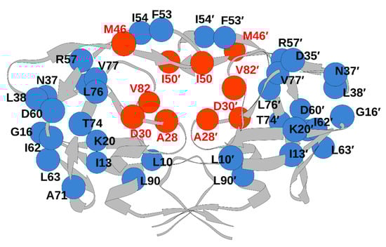 Residues in HIV-1 PR subtype C that are prone to mutations (blue: away from the active site; red: active site).