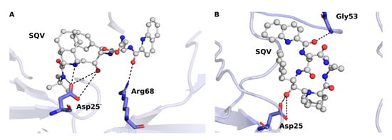 The hydrogen bond interactions of HIV-1 PR subtype C with SQV (A) WT and (B) L38HL. The figure was adapted from Venkatachalam et al. [59].