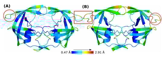 Comparison of hinge regions (red circles and rectangles) showing lower (blue) and higher (red) fluctuations in (A) WT and (B) L38HL HIV-1 PR subtype C. The figure was adapted from Sankaran et al. [37].