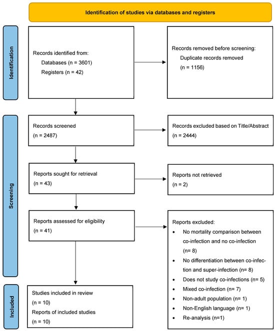 From the 43 reports initially sought, 41 were retrievable. From these 41 studies, 31 were excluded. Eight studies were excluded as they did not compare the outcome of mortality between co-infected and not co-infected patients [14,15,16,17,18,19,20,21]; eight studies were excluded as they did not differentiate between co-infections and super-infections [22,23,24,25,26,27,28,29]; five studies were excluded as they did not study co-infections [30,31,32,33,34]; seven studies were excluded as the co-infection was of mixed causes (viral, bacterial, fungal) [35,36,37,38,39,40,41]; one study was excluded as it also included a pediatric population [4]; one study was excluded as it was written in a non-English language [42]; and one was excluded as it was a re-analysis of an included study [3].