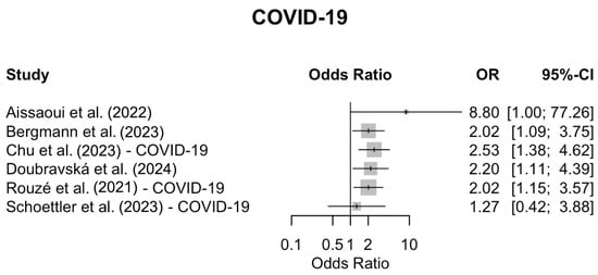 Forest plots were generated to visually summarize the individual study findings. Figure 2 shows the odds ratios and 95% CIs for COVID-19 studies, while Figure 3 presents the corresponding data for influenza studies. No meta-analysis was performed; the plots are presented for descriptive purposes only, with odds ratios displayed on a logarithmic scale to facilitate comparison.2