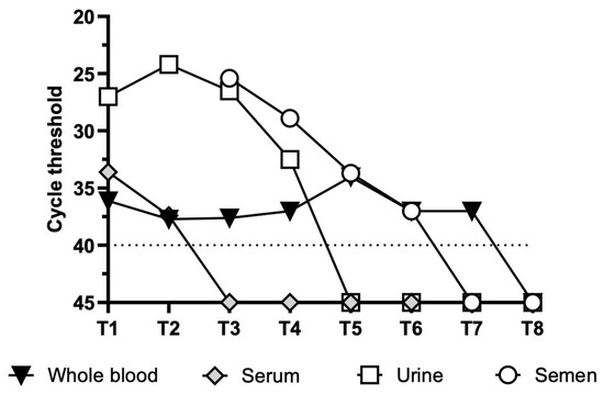 The semen samples tested positive (Ct 25.2) from the first analyzed sample (T3, 15 DSO) to 86 DSO (T6, Ct 37).