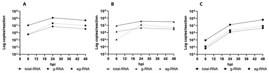 Time course of total, g-, and ag-RNA in OROV-infected Vero E6 cells established with the ddPCR method. (A) Lysate-associated total, g-, and ag-RNA; (B) cell-associated total, g-, and ag-RNA; (C) total, g-, and ag-RNA in the released compartment (supernatant). The results are expressed as copies/reaction.